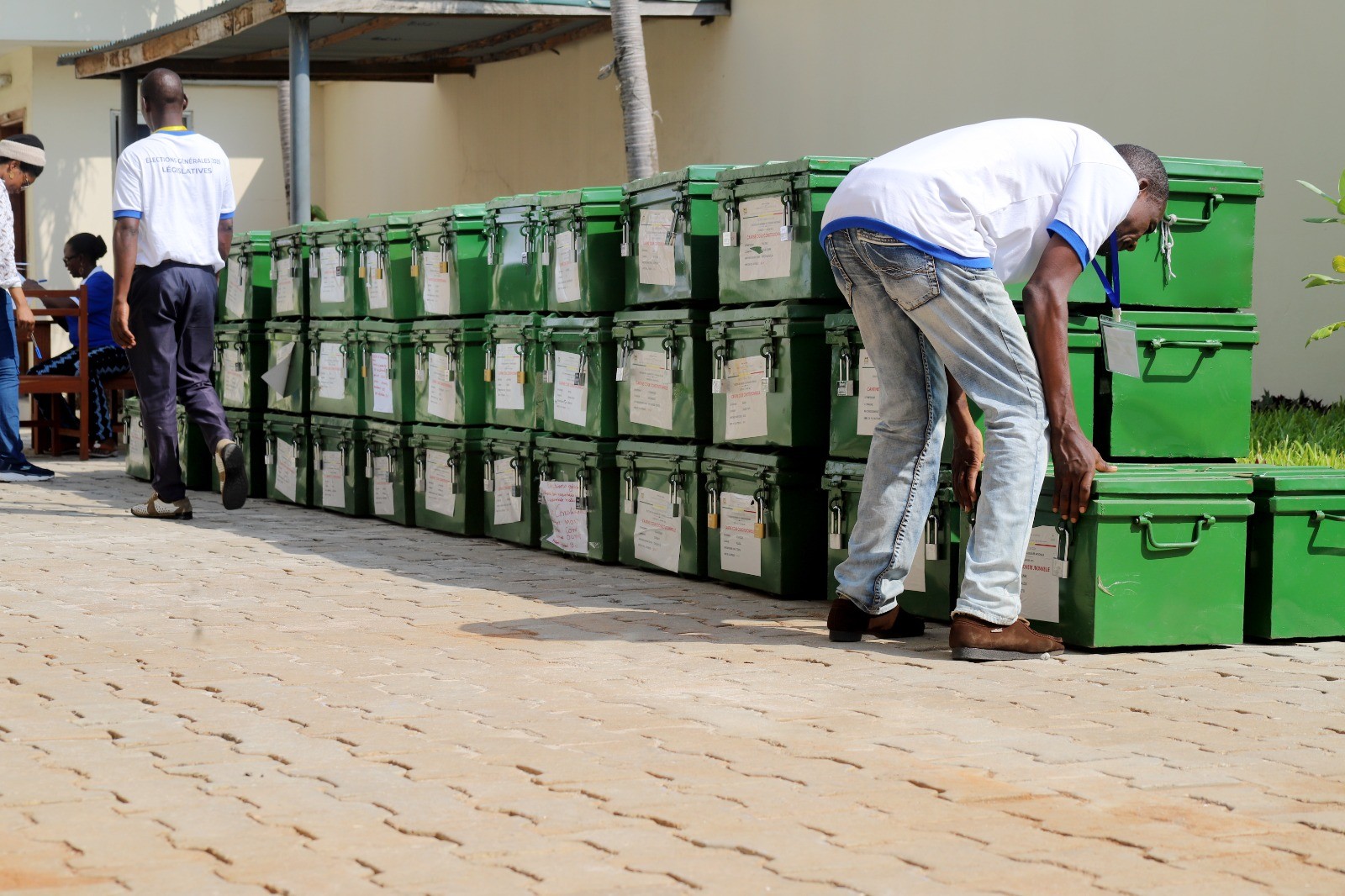 Il était exactement 15h52 lorsque le camion transportant les cantines électorales a franchi le perron de la Cour. Sur les 671 cantines attendues, 130 ont été déchargées dans un premier temps.